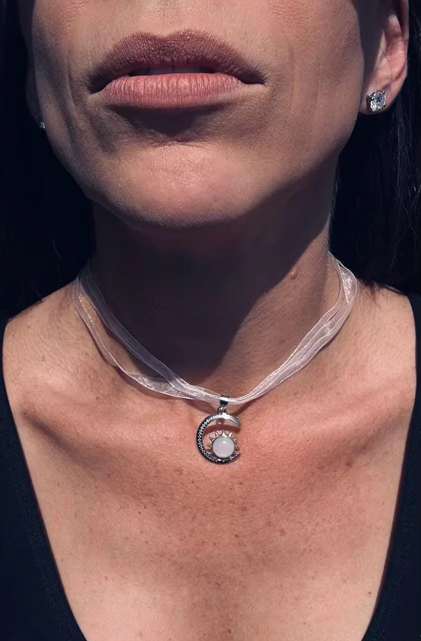 At the center lies a polished rose quartz stone—long revered as the crystal of unconditional love. Set within a radiant sun and crescent moon design, this piece represents harmony between light and shadow, intention and intuition.