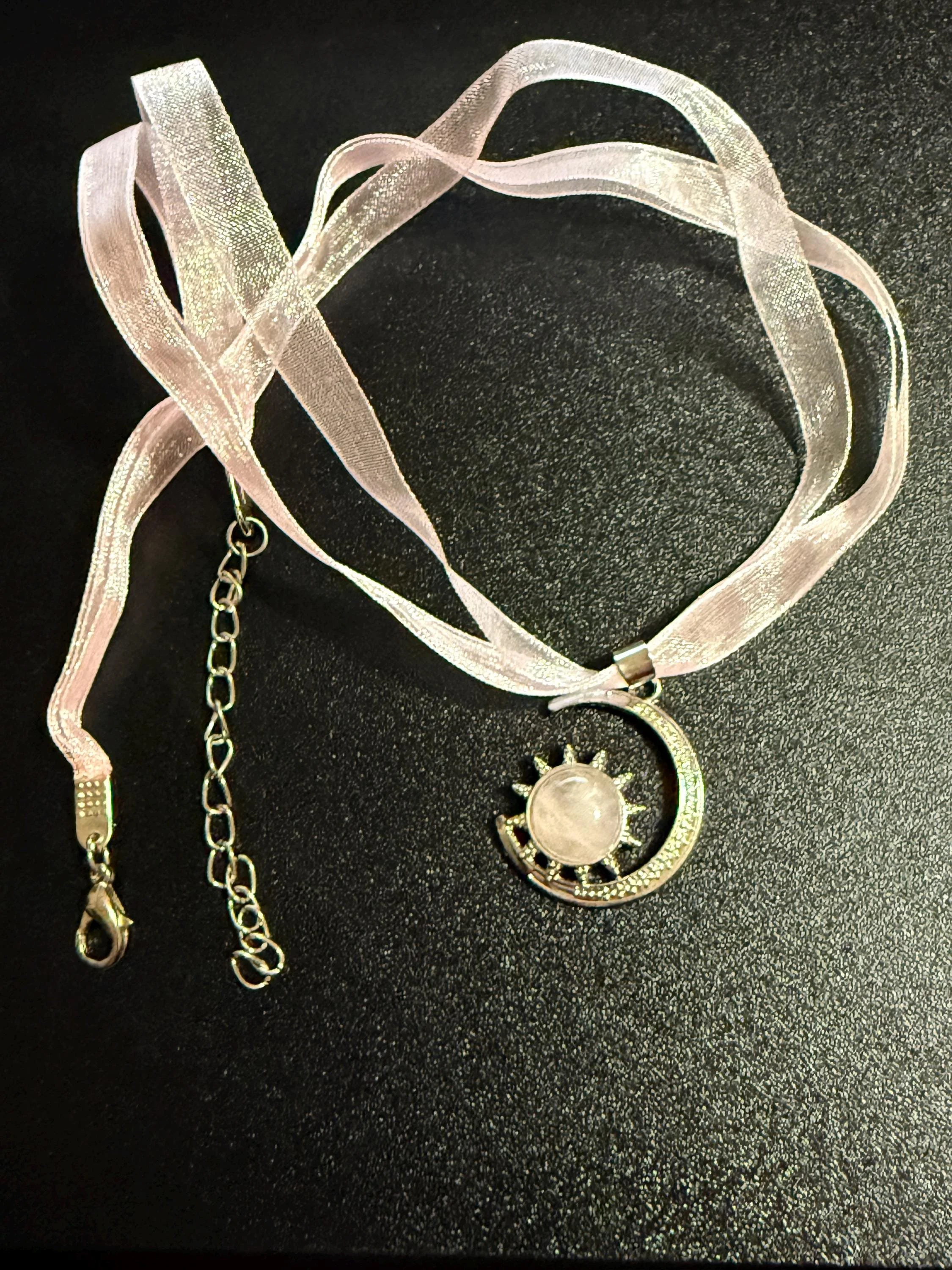 The delicate blush silk ribbon adds a romantic, elevated touch, while the adjustable chain allows you to style it your way—close to the heart or layered with your favorite pieces.